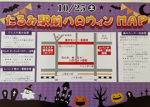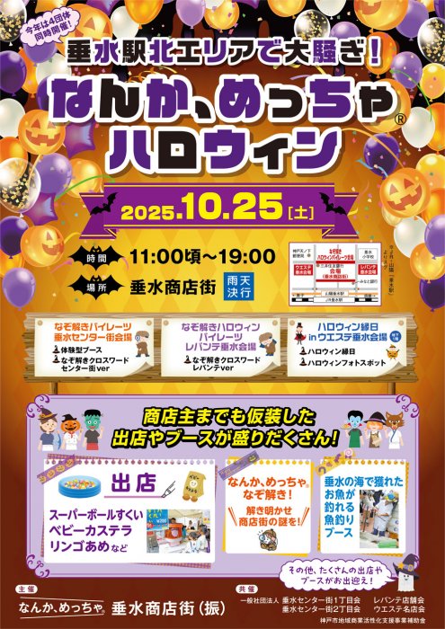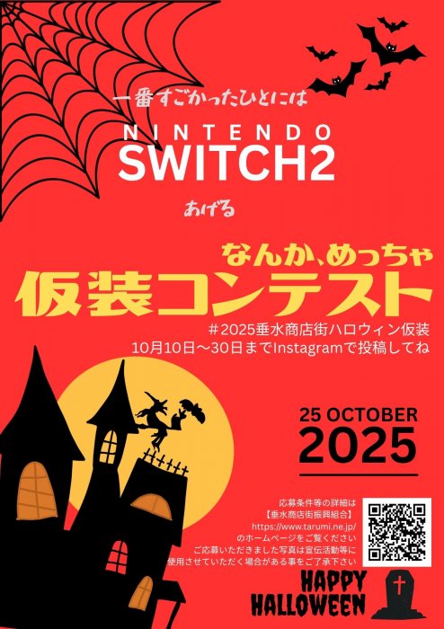 2025年10月25日(土)に今年も「なんか、めっちゃ®︎ハロウィン」が開催されます!! 今年は垂水商店街振興組合とウェステ・レバンテ・垂水センター街との合同開催となります!! タルミンジャーも参加するので探してみてくださいね。 Switch2が当たるハロウィン仮装大会も開催中です!! 詳細は下記URLへ!!